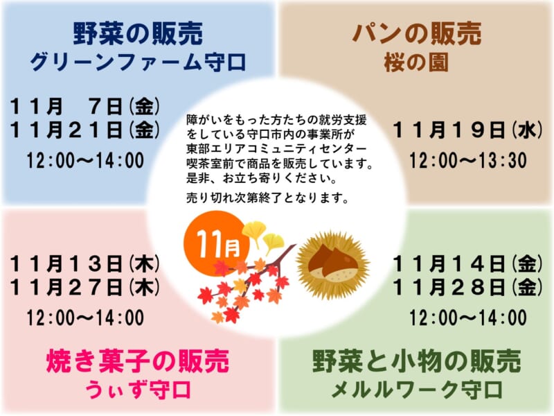 11月の野菜・パン・洋菓子・小物販売の日程です